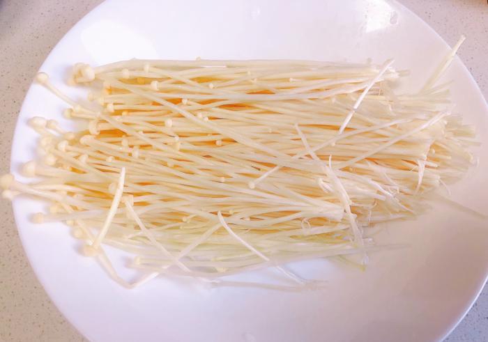 步骤3、金针菇切掉根部后,用手撕碎,然后清水洗净备用。