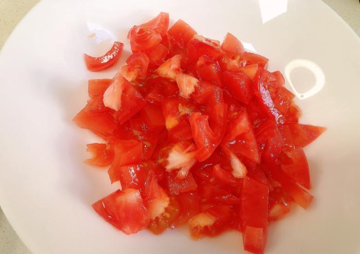 步骤2、西红柿洗净后,用开水焯烫一下,去皮后切丁备用。