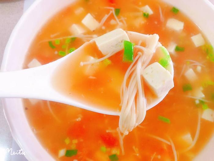 金针菇豆腐汤从外观上来说,金黄中透漏点点红色,其实就是西红柿起到的关键作用,所以让汤品品尝起来更加富有层次感,而除了这几点以外,金针菇豆腐汤的营养价值也是极高的,因为其中的西红柿就含有大量的维生素C,美白嫩肤的同时还能补充身体所需营养,而金针菇又是菌菇类食材,含有大量的氨基酸等成分,可以润肠通便,提高免疫力哦。