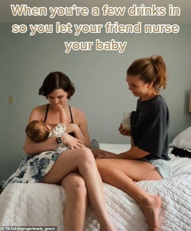 格蕾丝在分享的短视频中说,“当你喝了太多酒后,就让你的闺蜜来哺乳你的宝宝吧”。