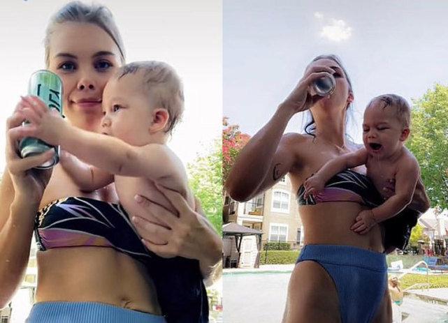 格蕾丝顺便还分享了一段怀抱婴儿喝气泡水的画面,小家伙儿似乎是因为没有抢到易拉罐而大哭起来。