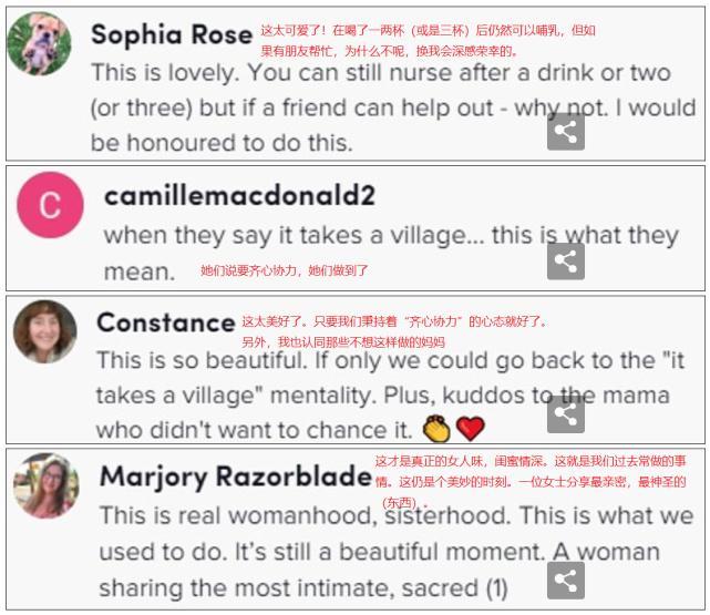 不过相对于这些感觉不舒服的人,还有一些人认为闺蜜之间互相帮助,这是一件很好的事情,“这才是真正的闺蜜情深”。还有人觉得这没什么大不了的,“几个世纪以来,很多妈妈都是这样做的,让婴儿吃饱才是最重要的”。