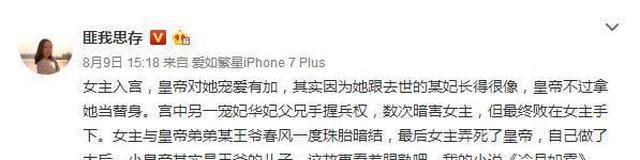 近日,作家匪我思存在微博上突然正面怼起了《甄嬛传》作者流潋紫,称其抄袭了自己的作品《冷月如霜》,并且写出了自己的故事梗概:女主入宫,皇帝对她宠爱有加,其实因为她跟去世的某妃长得很像,皇帝不过拿她当替身。宫中另一宠妃华妃父兄手握兵权,数次暗害女主,但最终败在女主手下。女主与皇帝弟弟某王爷春风一度珠胎暗结,最后女主弄死了皇帝,自己做了太后。小皇帝其实是王爷的儿子。这故事看着眼熟吧,我的小说《冷月如霜》