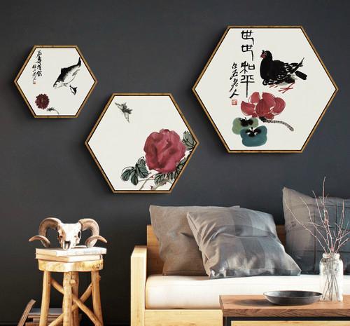 齐白石浮世清欢牡丹图客厅装饰画六边形禅意中式国画水墨荷花挂画