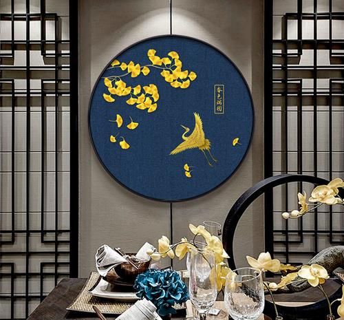 现代新中式客厅装饰玄关中国风卧室壁画实木圆形花鸟国画禅意挂画