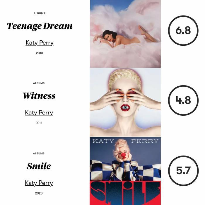 婊叉直到2021年才肯给《Teenage Dream》打出6.8分,而给水果姐的第一篇专辑评分是《Witness》,仅4.8分,也为当年网暴水果姐“贡献”自己的力量。