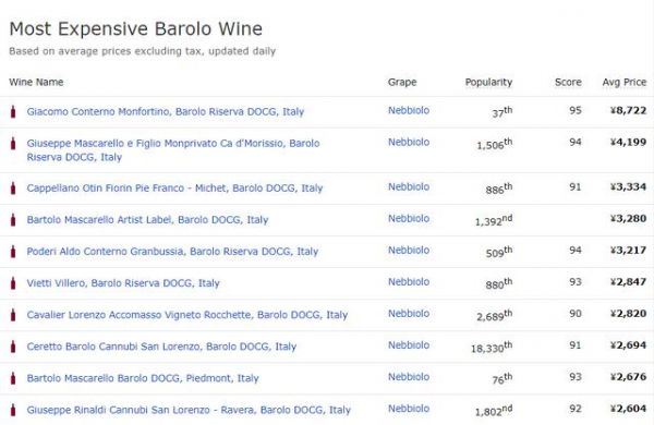我们在Wine Searcher上分别搜索巴罗洛和巴巴莱斯科最贵的葡萄酒,从前十名可以看出,巴罗洛无论是榜首还是整体上都比巴巴莱斯科贵不少,最贵的这款孔特诺梦馥迪诺巴罗洛珍藏干红(Giacomo Conterno Monfortino, Barolo Riserva DOCG)同时也是意大利最贵的葡萄酒。