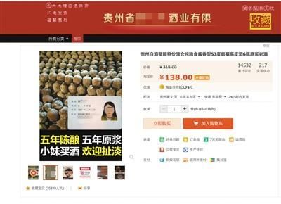 贵州省黔九天酒业有限公司在淘宝平台上的店铺首页,主打产品就是“茅台镇洞藏酒”。一箱6瓶装的洞藏酒价格为138元,平均一瓶(一斤装)价格为23元。为了让消费者相信产品质量,商家把公司销售主管陈洪敏的身份证和洞藏酒放在一起拍成图片,挂在电商平台进行展示,并且打出“五年陈酿、五年原浆、小妹卖买酒、欢迎扯淡”的口号。