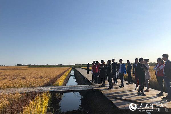 “网络媒体龙江行”采访团一行深入绥化庆安水稻田地采访。韩婷澎 摄