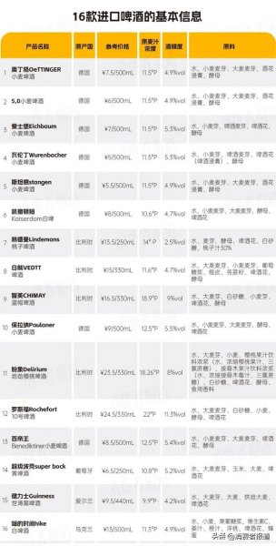 以下是此次口碑评价的16款进口啤酒的基本信息: