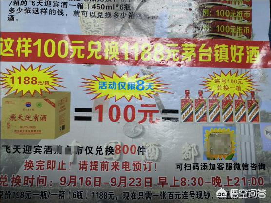 连号百元大钞换茅台镇酒的欺骗式营销,现在在一些二三线以下的城市中仍然层出不穷的。经常有酒友发了这样的截图给小六我,希望通过小六给大家普及以下。