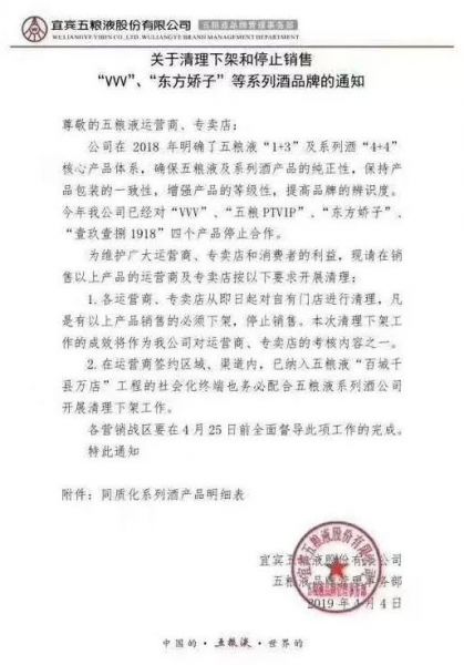 4月4日,五粮液品牌管理事务部下发通知称,今年已对“VVV”“PTVIP”“东方娇子”“壹玖壹捌1918”四个产品停止合作。通知同时要求销售以上产品的运营商及专卖店按以下要求开展清理:
