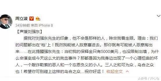 在京东CEO刘强东陷入涉嫌性侵风波后,9月3日,周立波在微博声援刘强东。“据我对刘强东先生的印象,他不会是那样的人,除非我看走眼。”