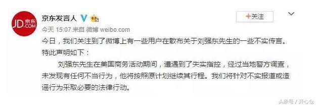 9月2日下午,刘强东的公司对此事给予了回应。不过,刘强东的公司称网络上的消息不实,但是却变相承认了刘强东子啊美国商务活动期间确实是遭到了指控,不过,他们称之为「不实指控」,还称经过调查没有发现不当行为。