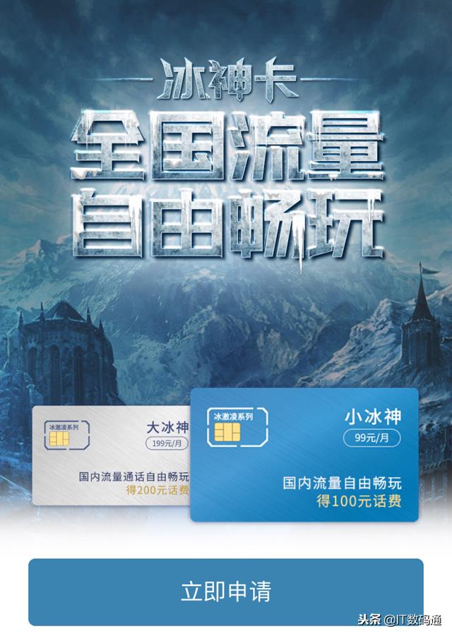 跟之前的冰激凌套餐一样,冰神卡可谓是此卡的衍生卡,基本上属于一个性质的,主要作用是实现全国流量不限量,冰神卡分为大冰神卡和小冰神卡。