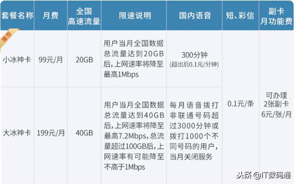 套餐方面,小冰神卡月费是99元/月,国内流量不限量,300分钟国内语音,短彩信0.1元/条。