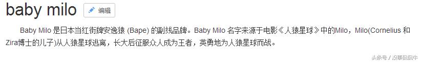 Baby Milo 是日本当红街牌安逸猿 (Bape) 的副线品牌。Baby Milo 名字来源于电影《人猿星球》中的Milo,Milo(Cornelius 和 Zira博士的儿子)从人猿星球逃离,长大后征服众人成为王者,英勇地为人猿星球而战。