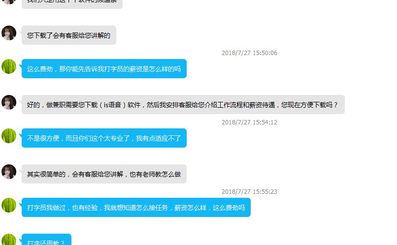当你下载好以后,他会让你在is语音里面加好友,在is里面私聊,然后会一步一步的诱导你进入一个直播的房间,进去以后,会有一个专门接待的,让你加这个接待人员的好友,到这里,你最初加qq好友的那个骗子的任务就完成了,接待你的这个人开始给你介绍兼职任务,会有10多种,让你去选择,不管你选择哪一种,他都会给你发一个会员收费的价目表,让你先冲会员,不冲会员不给兼职,其实你交了钱也没有任务!这就是我经历的is语音兼职骗子,希望找工作、作兼职的朋友们提高警惕!