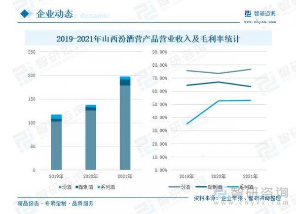 从公司产品营收来看,2019-2021年,公司以汾酒为主要经营产品,其产品营业收入占比高达85%以上,2021年,公司汾酒营业收入为179.2亿元,同比增长41.90%;配制酒营业收入为12.5亿元,同比增长91.39%;系列酒营业收入为6.38亿元,同比增长12.73%。从产品的毛利率来看,2021年,汾酒的毛利率为76.55%,同比上涨3.1个百分点;配制酒为63.71%,同比下降3.33个百分点;系列酒为53.10%,同比上涨0.41个百分点。2021年,公司进一步深化汾酒“1357+10”的市场布局,深耕线下渠道,发力线上电商平台,实现了汾酒产品营业收入和毛利率的同步增长。