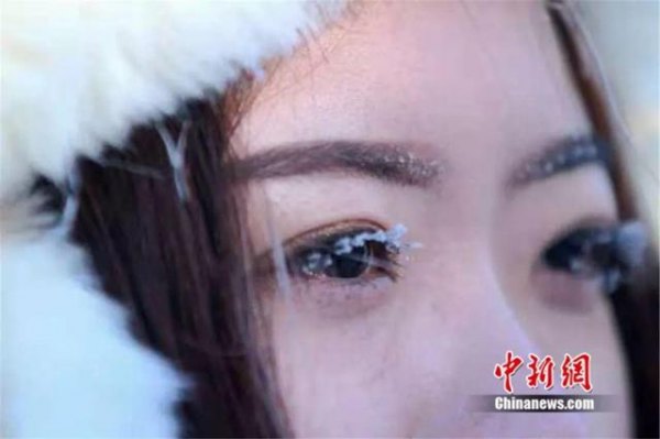 ↑东北姑娘的睫毛染上霜花(张澍/摄)