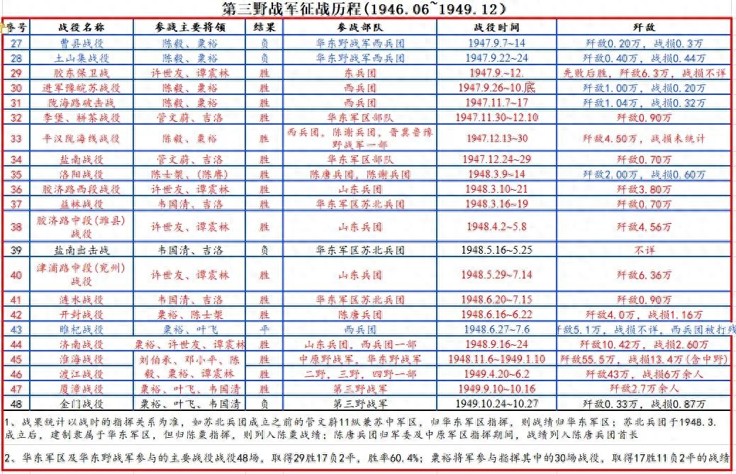 根据《第三野战军战史》统计,解放战争期间,野战军歼敌176.3万人、军区部队歼敌46.2万人、清剿土匪25.1万人,华东军区暨第三野战军歼灭敌人数量达247.6万人。