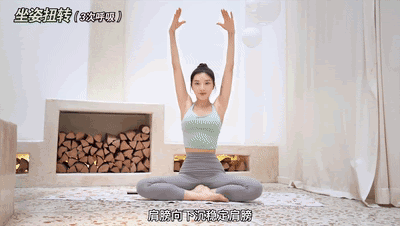 2、随呼气,臀部缓慢向上抬起。3、呼气,落下,完成8次。注意:双手放在大腿外侧,呼气上抬时双腿向两侧打开,对抗双手,感受臀侧发力。功效:促进骨盆区域和腹部的血液循环,更好地滋养女性的子宫和卵巢,平衡激素;强健腹部,髋屈肌和脊柱。动作四:坐姿扭转