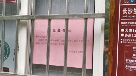 记者随后购票进入园内,园内的游客并不算多。记者来到象行为驯化展示馆门口,但通往表演区域的通道没有打开。“爸爸,今天怎么没有大象表演啊?”一个小朋友对带着他来参观的父母问道。门口的电子显示屏和纸质通知上均显示:由于“舍笼检修”,动物园停止象行为训练驯化展示表演。
