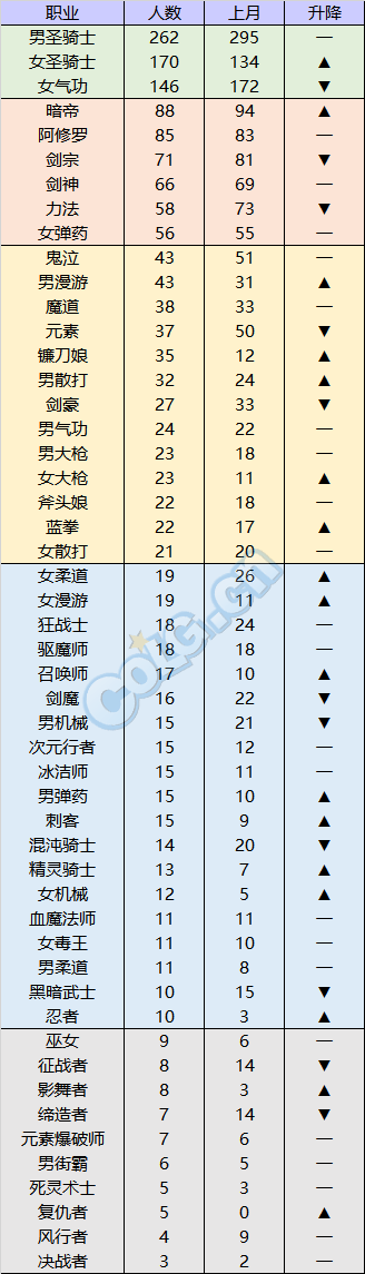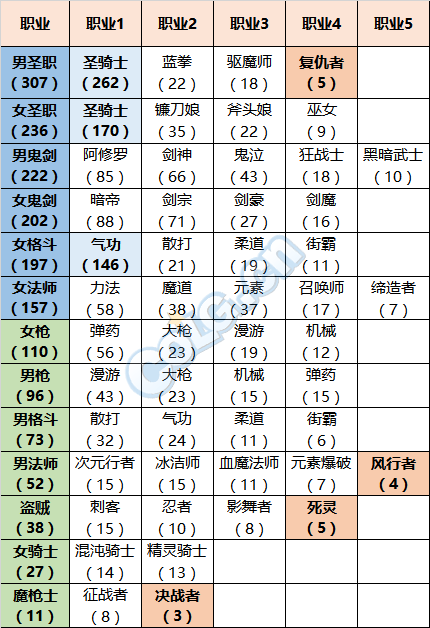 * 调查时间为更新改版后的第一个周六和周二的上午时间,调查了约250个队伍的分布图。表格的顺位以职业的人数来罗列,与实际略有差异。