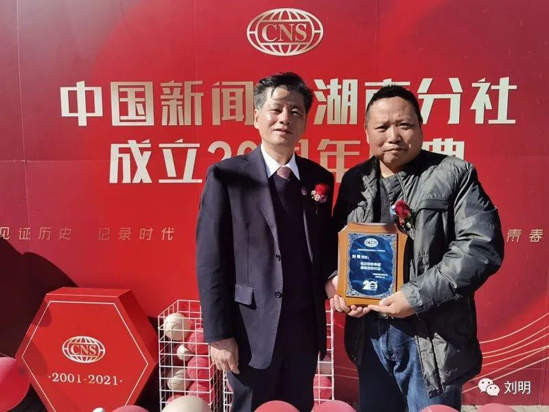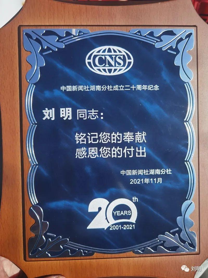2021年11月30日,中新社分社成立二十周年,刘明应邀参加聚会,社里给刘明颁发了一块奖牌,上面写着:铭记您的奉献,感恩您的付出。
