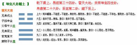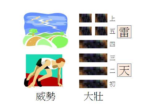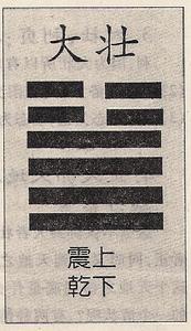 君子壮大,当然亨通,然而,声势隆盛壮大,就必须严守纯正;否则,就有陷于横暴的可能。所以说,必须坚守纯正,才会有利。主客双方都积极主动,主方与客方剧烈地竞争着。主方的素质良好,态度强硬,而客方的素质不佳,态度随和,主方占有绝对优势,然而,主方的强硬态度,可能表现出傲慢、粗暴和自满,可能滥用权力,导致不良结果。卦辞指出当前的状态利于坚持下去,不需要大的变化,防止行为失度。