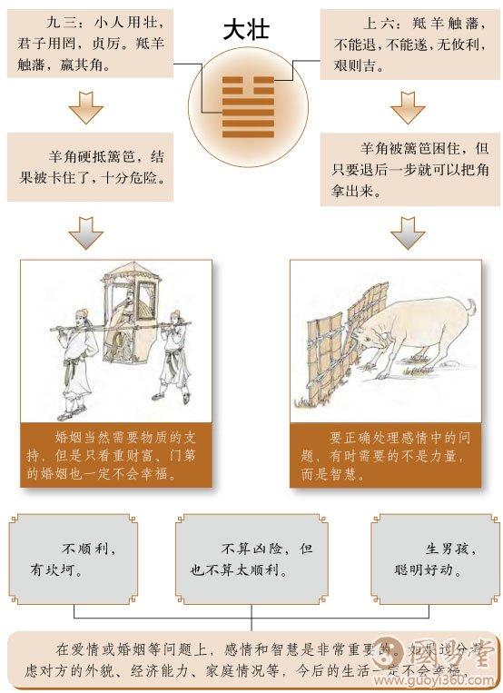 "羝"(dī),公羊。"藩"(fān),篱笆:藩篱。"羸"(léi),瘦弱:羸瘦。这里,公羊和篱笆都是形象比喻,公羊代表主方,积极主动,有力量,而且狂妄;篱笆代表客方,没有自卫的力量,对主方态度柔和。这只狂妄的公羊,轻视态度柔和的篱笆,轻举妄动,角被缠着了。这条爻是阳爻在阳位,当位,与六阴有应。当位表明主方态度强硬,有可能制约客方,是潜在的对主方有利的因素;有应表明客方态度随和,正好可以接受主方的制约,这潜在因素成了真正的对主方有利的因素。上爻是对中爻的补充,主卦的上爻和中爻都是阳爻,表示主方的素质非常好,实力极强,在这有利形势下,很可能态度强硬过度,表现出傲慢和粗暴,使得主方的进展遇到严重困难,所以爻辞说"贞厉"。