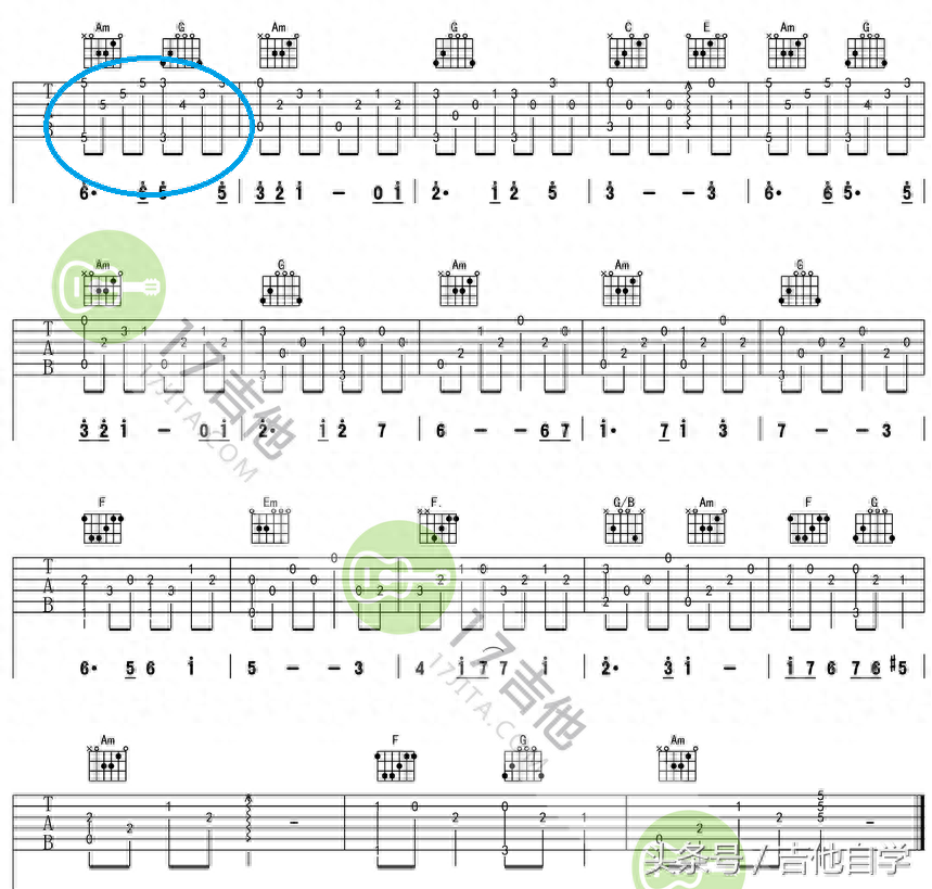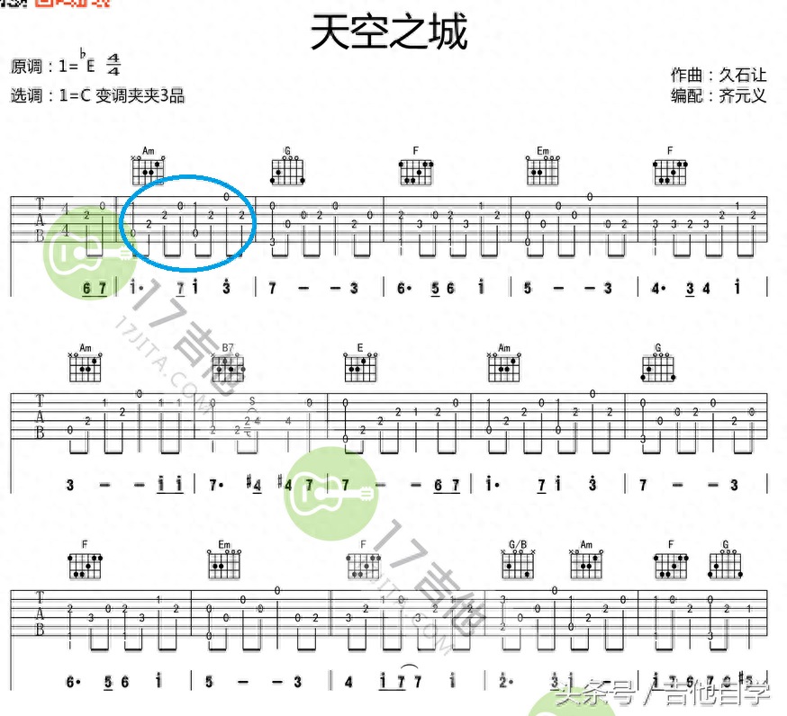 第二张谱子里面所标注的也就是天空之城的副歌部分,上面分别用了AM和弦的第五把位和弦和G和弦的第三把位和弦。谱子上照理说写成这样比较合理