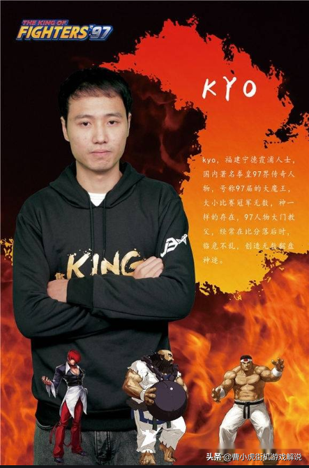 福建KYO主力八猪门,实力S级。其实越写到最后小虎越觉得没什么写的了,因为老K太出名了!甚至各位看官知道的都比小虎多。借此小虎简单说一下吧,老K拿过3届U联赛的冠军,被称为大门教父,一个把大门五郎开发到极限的顶级玩家。这个“炒菜男孩”据说上洗手间都在摇岚之山,老K打法属于多择,比较诡异。在这里科普一下什么是择,在拳皇97对战中将对手打倒之后,对手起身之前,你想要采取的进攻策略就是所谓的择,例如偷下盘,打逆向,近身抓等。小虎看过K神的直播,话语不多,说话言语穿透力不强,面色沉静,上次被辉辉3-15也是面不改色。现在属于半隐退状态,每两个月可能出来客串一下比赛,粉丝量最多,拳皇97流量的保证。