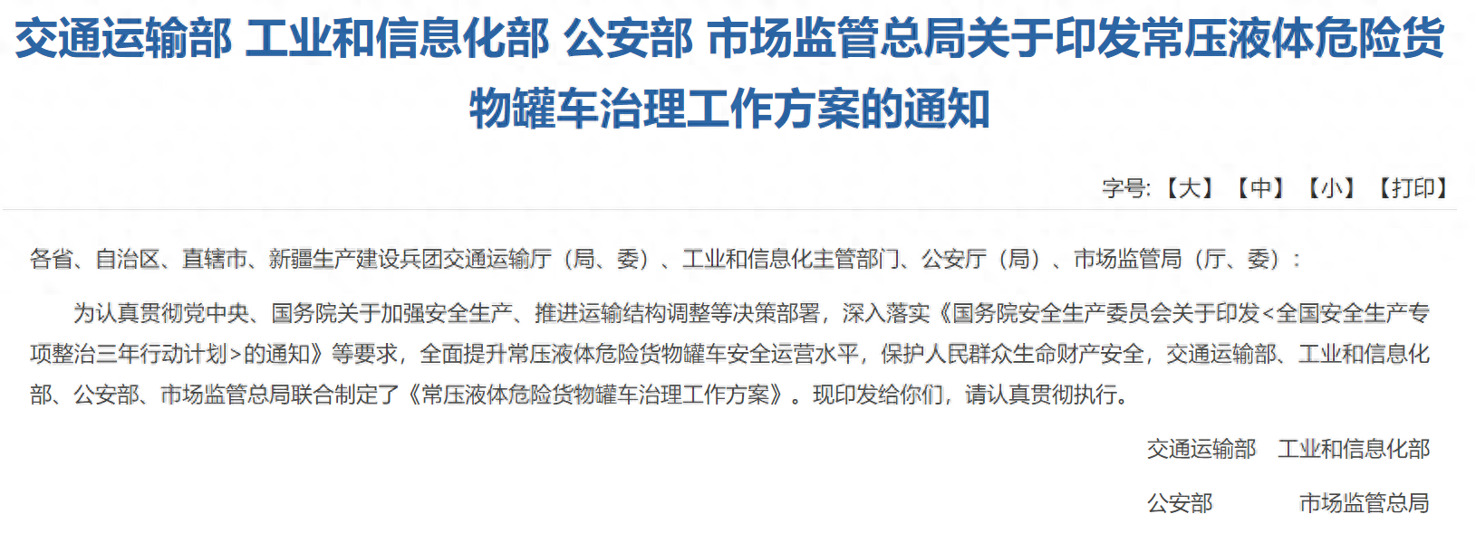 2021年4月8日,交通运输部、工业和信息化部、公安部、市场监管总局联合印发《常压液体危险货物罐车治理工作方案》。