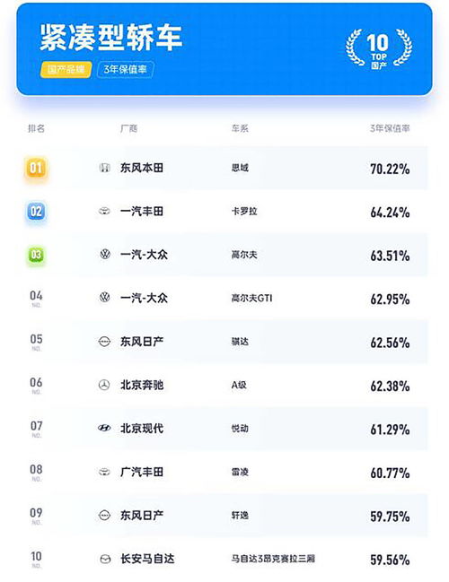 继续排名第三的是本田思域,作为紧凑型轿车的代表之一,思域一直以来都备受好评,其操控性和燃油经济性都表现出色,这也是其保值率居高的重要原因之一。