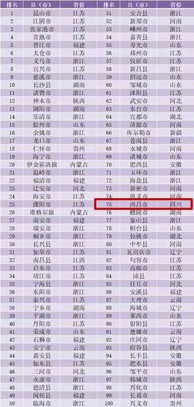 西昌市在2020年全国县域经济综合竞争力100强排名中位列75,是四川省唯一入选城市。