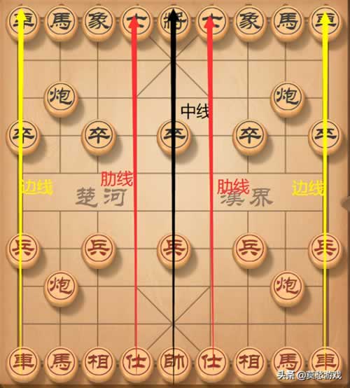 河界线:河界线通常中间标有楚河汉界,位于已方一侧的河界线又称之为巡河线,称对方的河界线为骑河线