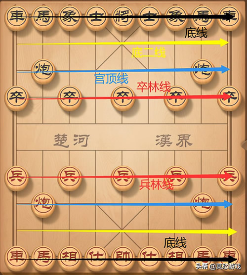 棋盘横线:双方最底下的一条线为底线,双方从下向上数第二条线为底二线、第三条线为宫顶线,兵卒所在的横线为卒(兵)林线