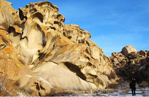 怪石峪风景名胜区是世界上最大的花岗斑岩象形怪石景观区,中国国家AAAA级风景名胜区。 怪石峪地理位置示意图(橘色)怪石峪风景区位于新疆博乐市东北约38公里处的中哈边境中国一侧的卡浦牧尕依山谷,以阿拉套山主峰自然分水岭为界,与哈萨克斯坦国相邻。海拔在780-1350米之间。整个风景区东西延伸18公里,南北宽约13公里(最大宽度22公里),总面积230平方公里,是目前已知的世界最大的象形怪石群落。怪石峪风景区紧傍亚欧大陆桥第一关–阿拉山口口岸,相距26公里;与准噶尔盆地名湖艾比湖相邻,相距30公里。
