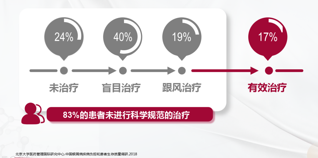 一份不完全的数据统计显示,83%的银屑病患者未获得有效治疗,其中盲目治疗的占40%,未治疗的24%,19%的人跟风治疗[2]。