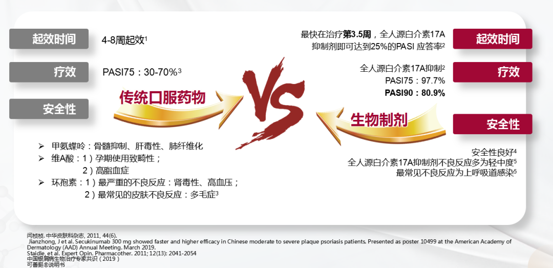 对比传统治疗药物,生物制剂在起效时间、疗效方面都表现良好:传统药物的起效时间为4~8周,而生物制剂最快在3.5周起效;近8成使用生物制剂的患者PASI评分(银屑病面积与严重性指数)在90以上,日常生活不受影响。