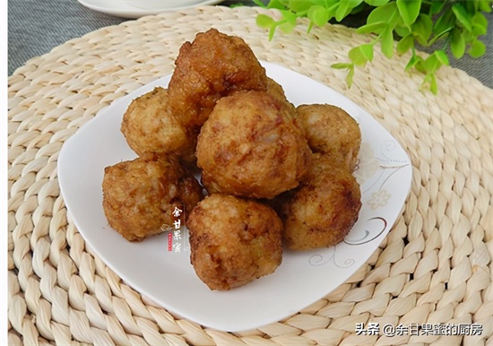 做法:除了清水和精盐,所有食材混合,分次加入清水搅打上劲,后加入精盐搅拌均匀,从虎口处挤出丸子,入锅炸制,浮起后捞出,可以复炸至外层香脆上桌。