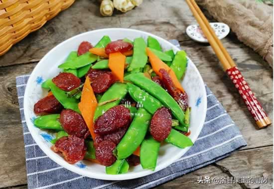 五、荷兰豆炒腊肠——荷兰豆鲜嫩,与腊肠是完美搭配,加入几片胡萝卜,好看又好吃。