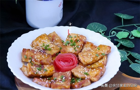 做法:豆腐切厚度均匀小块,入锅煎一煎至微黄,加入2汤匙蚝油、1汤匙番茄酱,适量的清水、葱花、酱油、精盐,焖一焖出锅,用番茄皮做花,撒上白芝麻,好看又好吃。