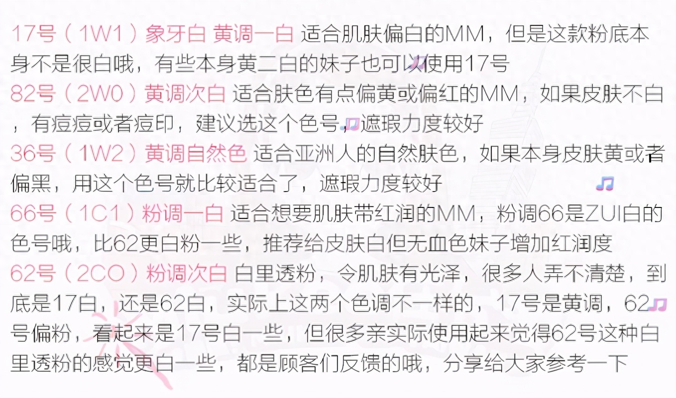 82号(2WO)黄调次白适合肤色有点偏黄或偏红的MM,如果皮肤不白,有痘痘或者痘印,建议选这个色号口遮瑕力度较好36号(1W2)黄调自然色适合亚洲人的自然肤色,如果本身皮肤黄或者偏黑,用这个色号就比较适合了,遮瑕力度较好66号( 1C1)粉调一白适合想要肌肤带红润的MM,粉调66是ZUI白的色号哦,比62更白粉一些,推荐给皮肤白但无血色妹子增加红润度62号(2CO)粉调次白白里透粉,令肌肤有光泽,很多人弄不清楚,到底是17白,还是62白,实际上这两个色调不一样的,17号是黄调,62卫号偏粉,看起来是17号白一些,但很多亲实际使用起来觉得62号这种白里透粉的感觉更白一些,都是顾客们反馈的哦,分享给大家参考一下