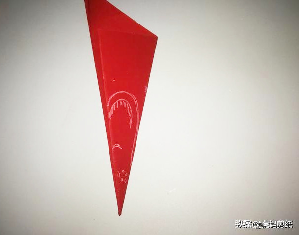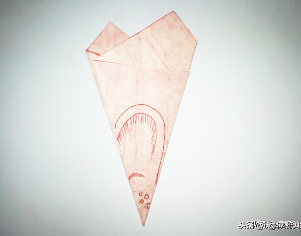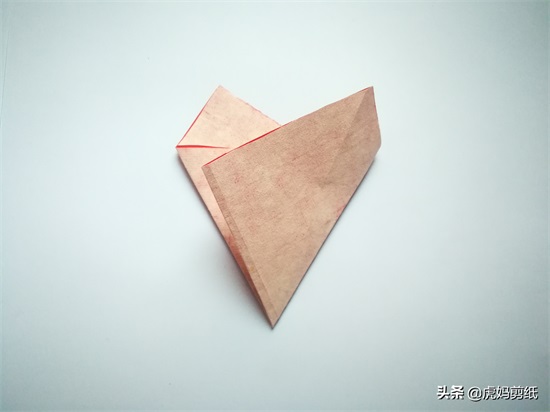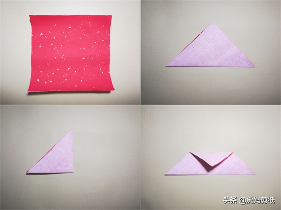 把正方形红纸对角线对折如图二,然后左右对折,得到一个90度直角三角形。接着展开图形,像图四一样将角的尖头向下对折,注意角与中点是重合的。