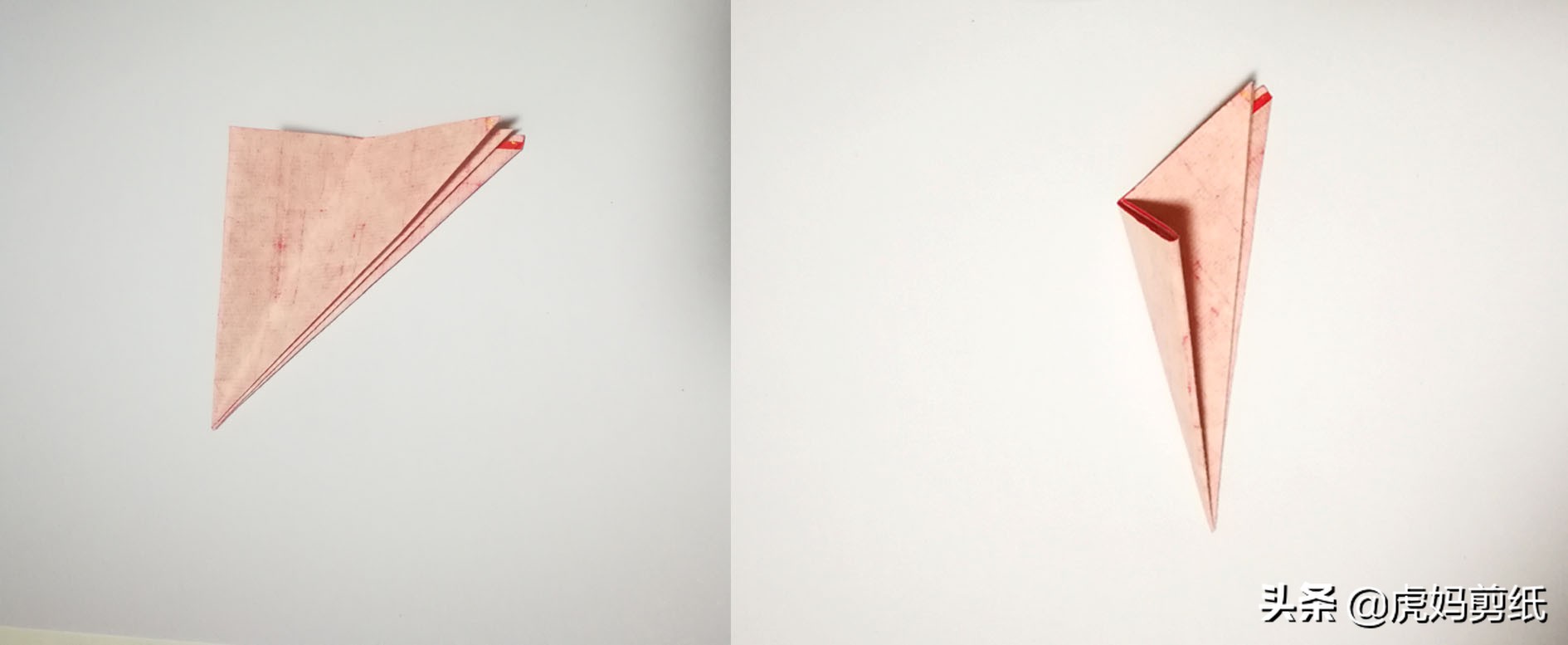 根据上述教程,先折一个三折对称折叠剪纸。左图为三折,再对折一次即可,参考下图。