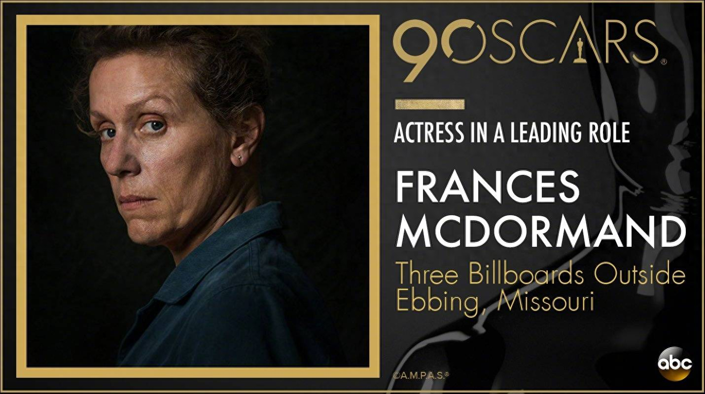 詹妮弗·劳伦斯和朱迪·福斯特颁奖 ,弗兰西斯·麦克多蒙德 的第2个奥斯卡影后,此前她曾在1997年凭借《冰血暴》获得第69届奥斯卡影后。并邀请现场所有女性影人起立,为每一位电影工作的女性献上掌声。“女演员们,女电影人,女制片人,女导演,女编剧,女摄影师,女作曲家,女设计师等等,大家都站起来吧!大家向四周看看吧,我们都有要讲述的故事”