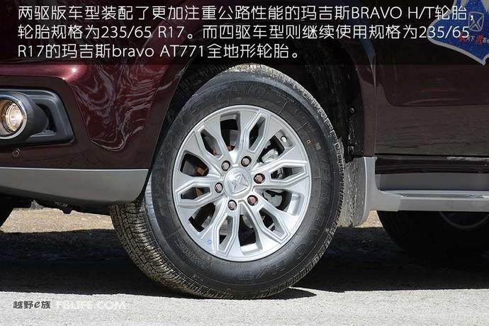 我们本次试驾的是两驱版,并非四驱车型,因此该车装配了更加偏向公路性能的玛吉斯BRAVO H/T轮胎,轮胎规格为235/65 R17。越野爱好者也别着急,在四驱版车型中,还将使用规格为235/65 R17的玛吉斯bravo AT771全地形轮胎。