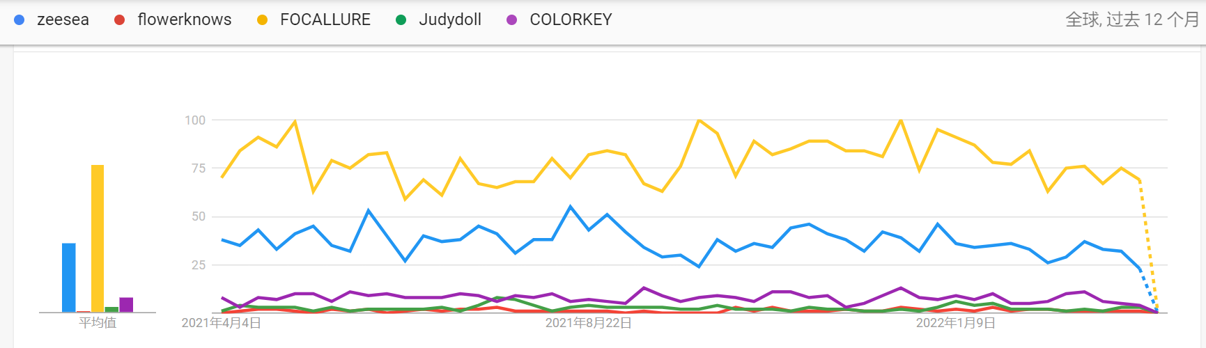 过去12个月,五个美妆品牌在Google网页搜索的热度情况
